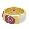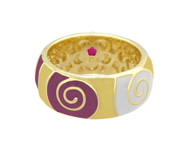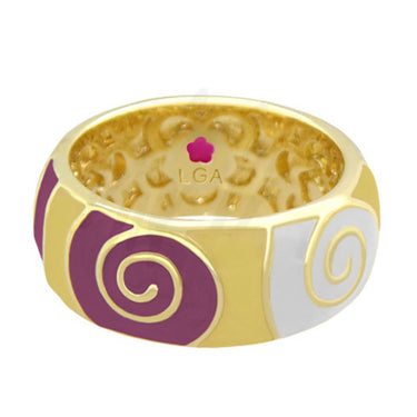 Part of the signature swirl collection, this ring is crafted of a solid brass base and plated with 18k gold. It features finely hand painted multi color enamel for a classic look.
